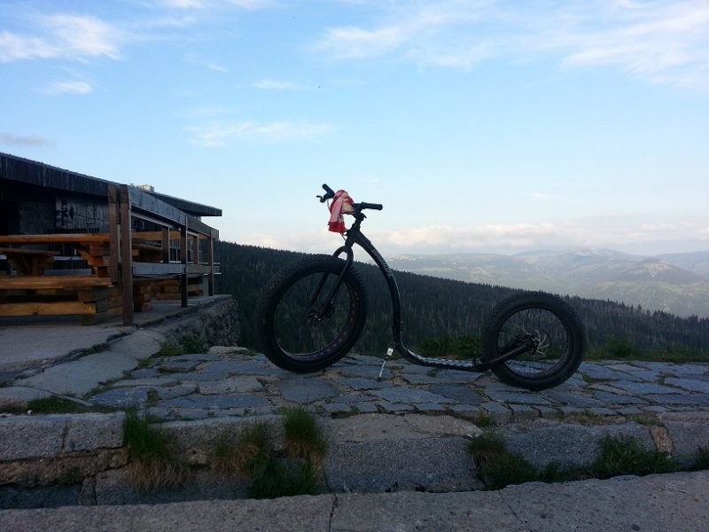 Protože čas nebyl mým přítelem, nelenil jsem a pálili jsme to s tlusťochem nejdřív přímo z kopce směrem na Pec pod Sněžkou, přes Václavák, Kolínskou a Pražskou boudu až nad Zahrádky. Krásný sjezd po šotolině i asfaltu. Paráda. Následoval lehčí houpavý přesun a asfaltové nekonečné svezení na Tetřeví boudy, kde jsem notně vyděsil skupinu německy hovořících turistů, neboť dunění tlusťocha na asfaltu u nich evokovalo příjezd ruských tanků do Berlína a hromadně se tedy jali krýt v blízkých příkopech a barikádách.